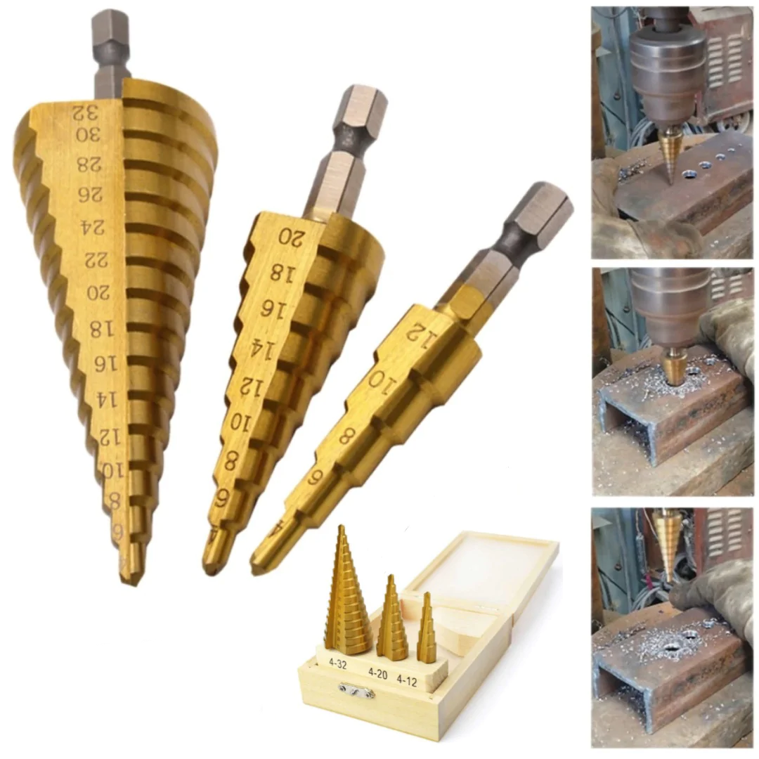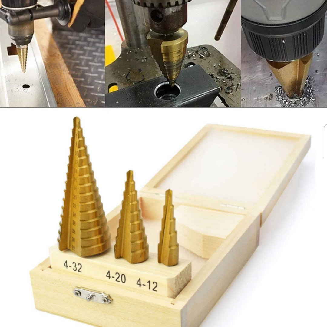 3 komada HSS čelika 4-32 mm, 4-20 mm i 4-12 mm u praktičnoj drvenoj kutiji